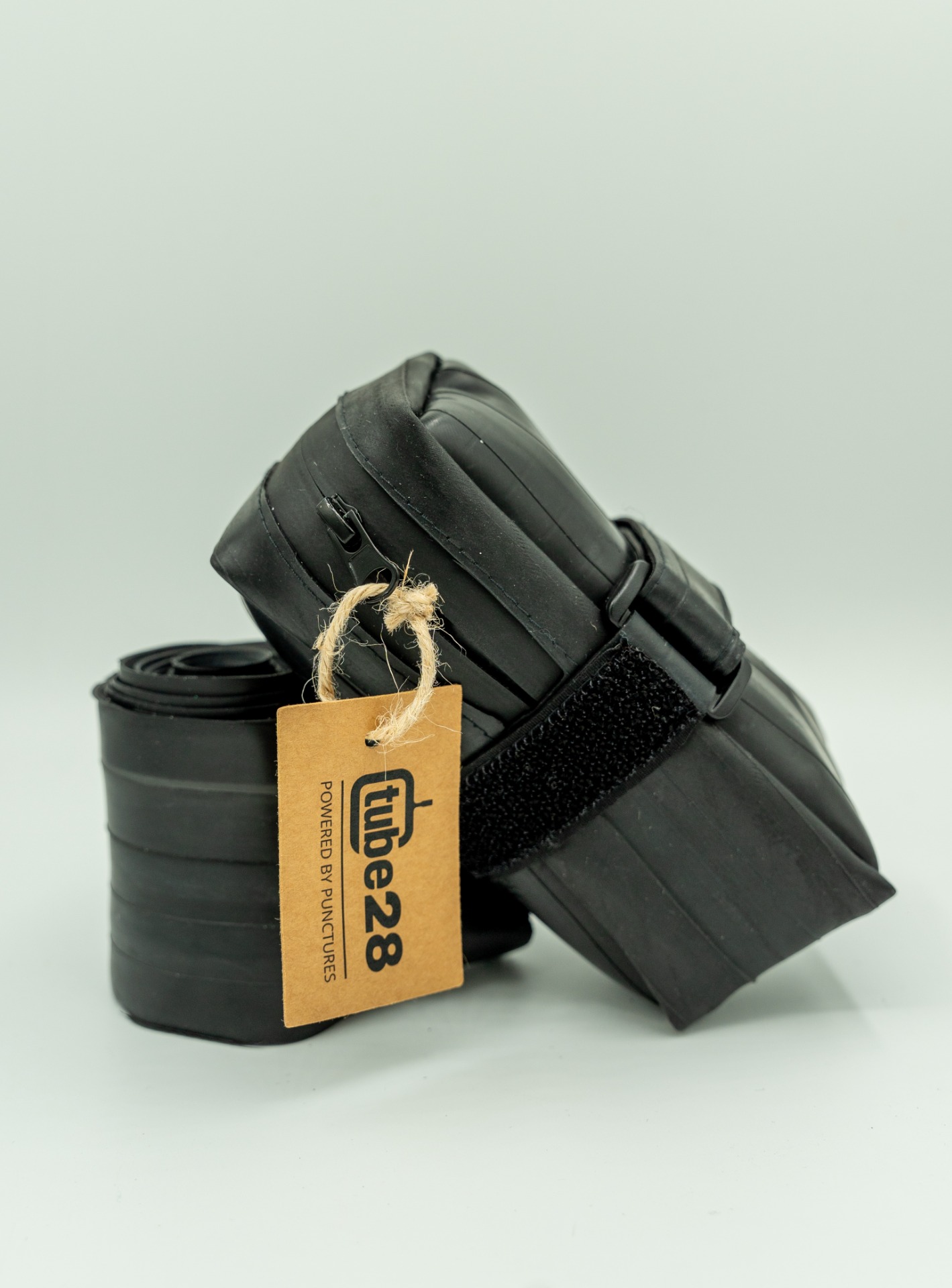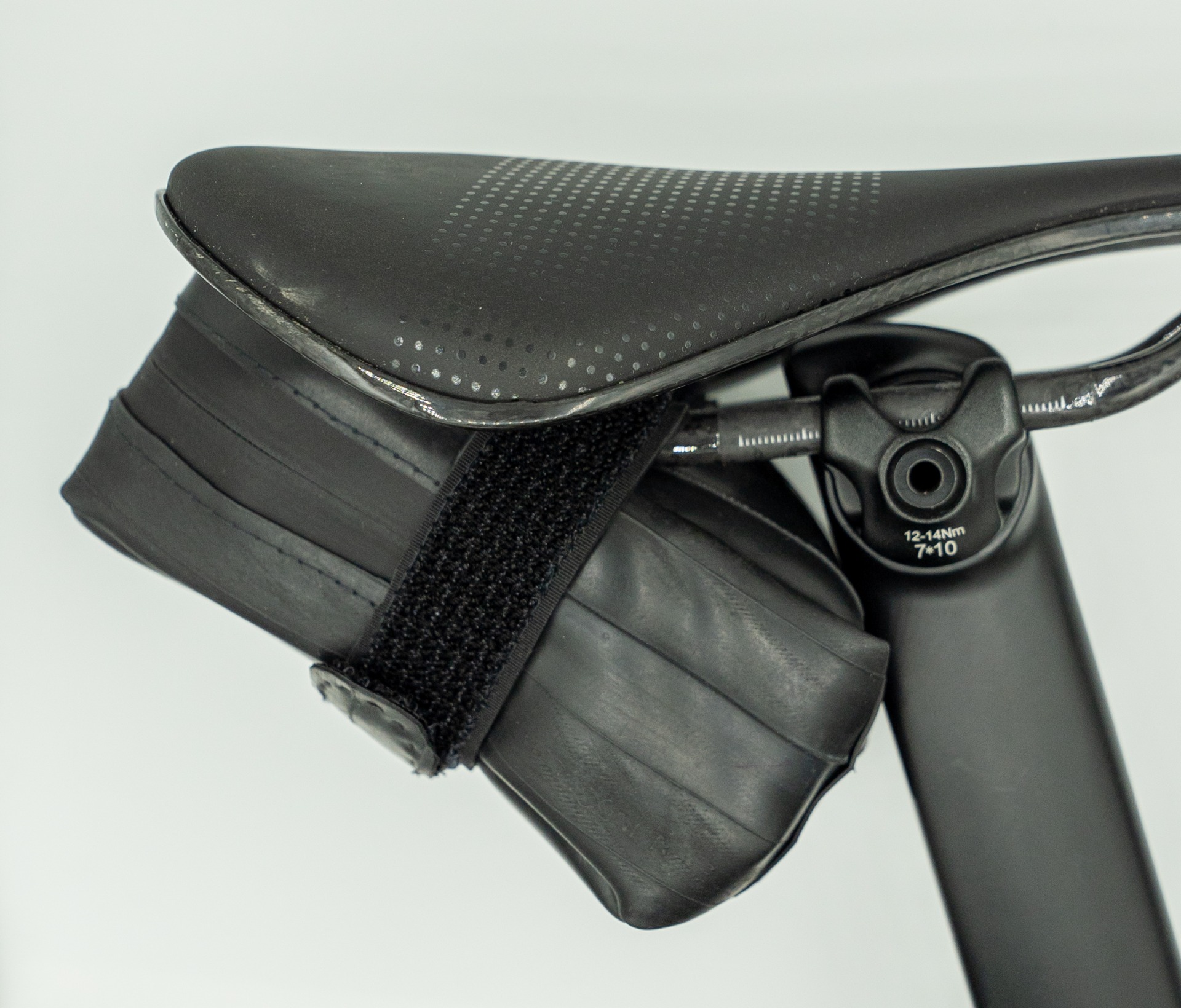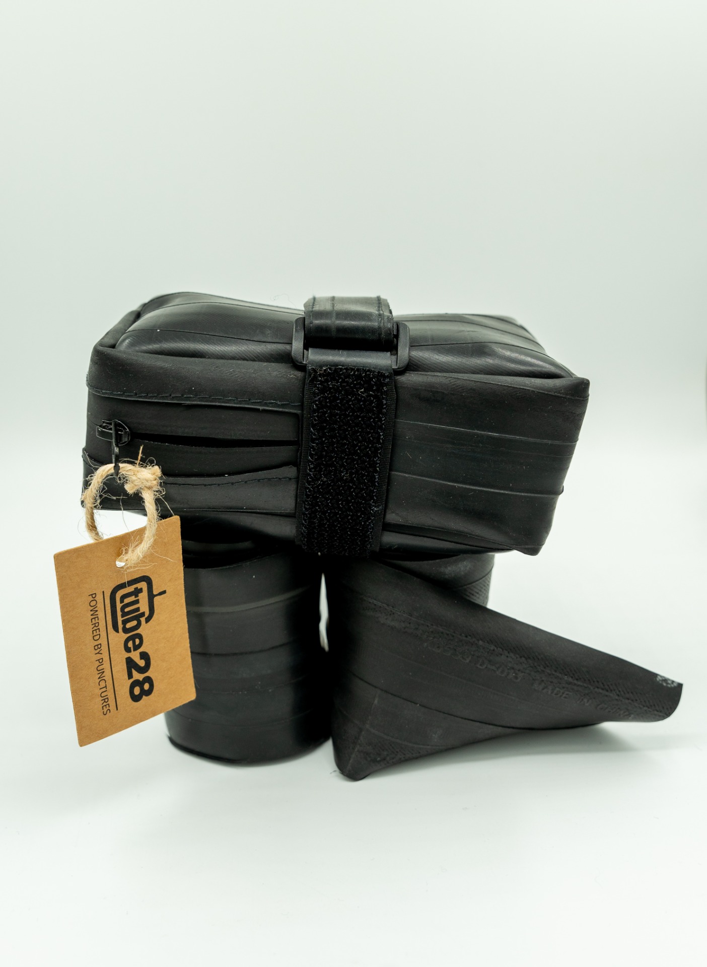 Ons zadeltasje is gemaakt van hergebruikte binnenbanden, waardoor elk exemplaar uniek is. Compact, waterafstotend en stevig – ideaal om je essentials zoals een binnenband, multitool en CO₂-patroon mee te nemen tijdens je rit.