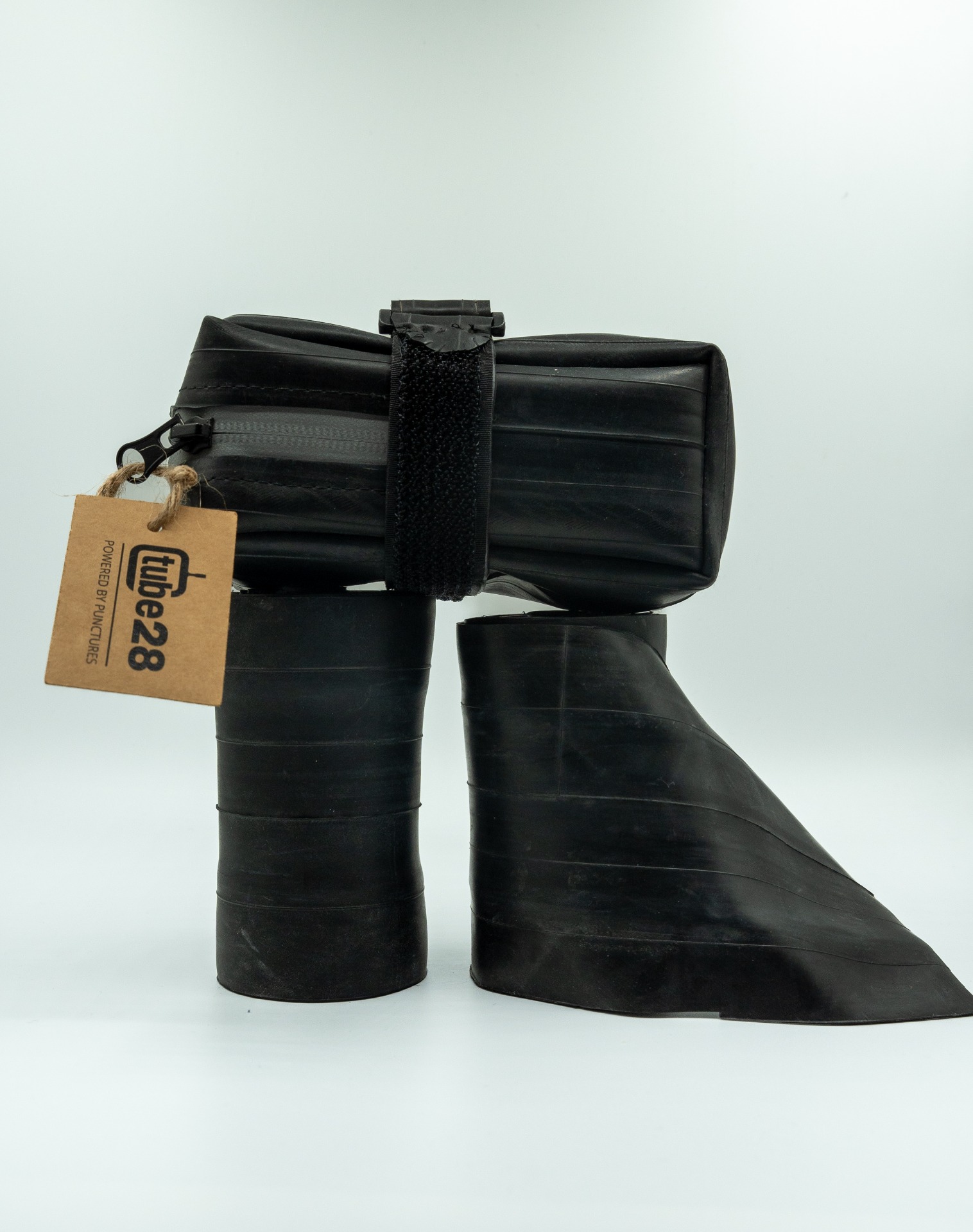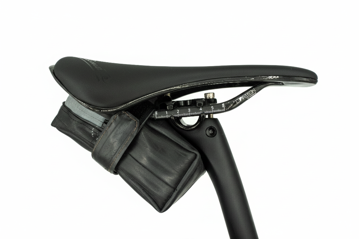 Ons zadeltasje is gemaakt van hergebruikte binnenbanden, waardoor elk exemplaar uniek is. Compact, waterafstotend en stevig – ideaal om je essentials zoals een binnenband, multitool en CO₂-patroon mee te nemen tijdens je rit.